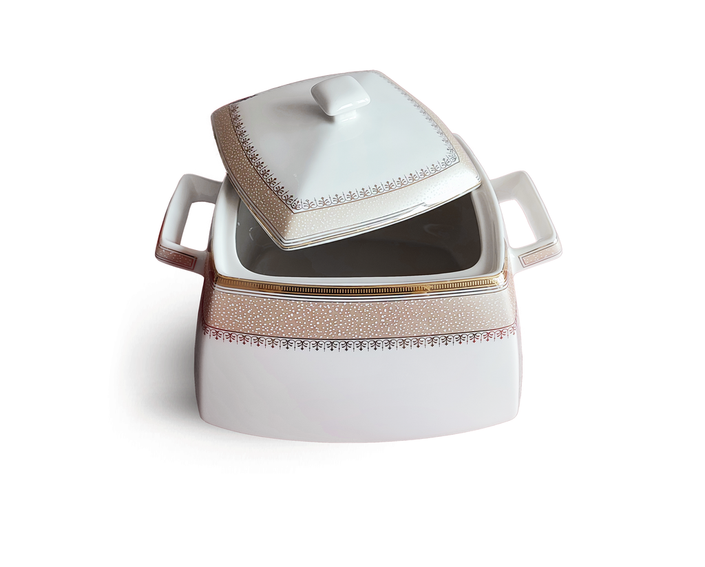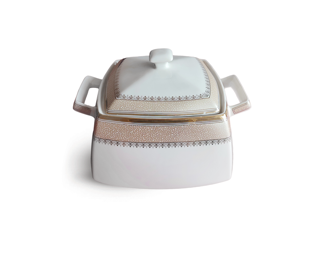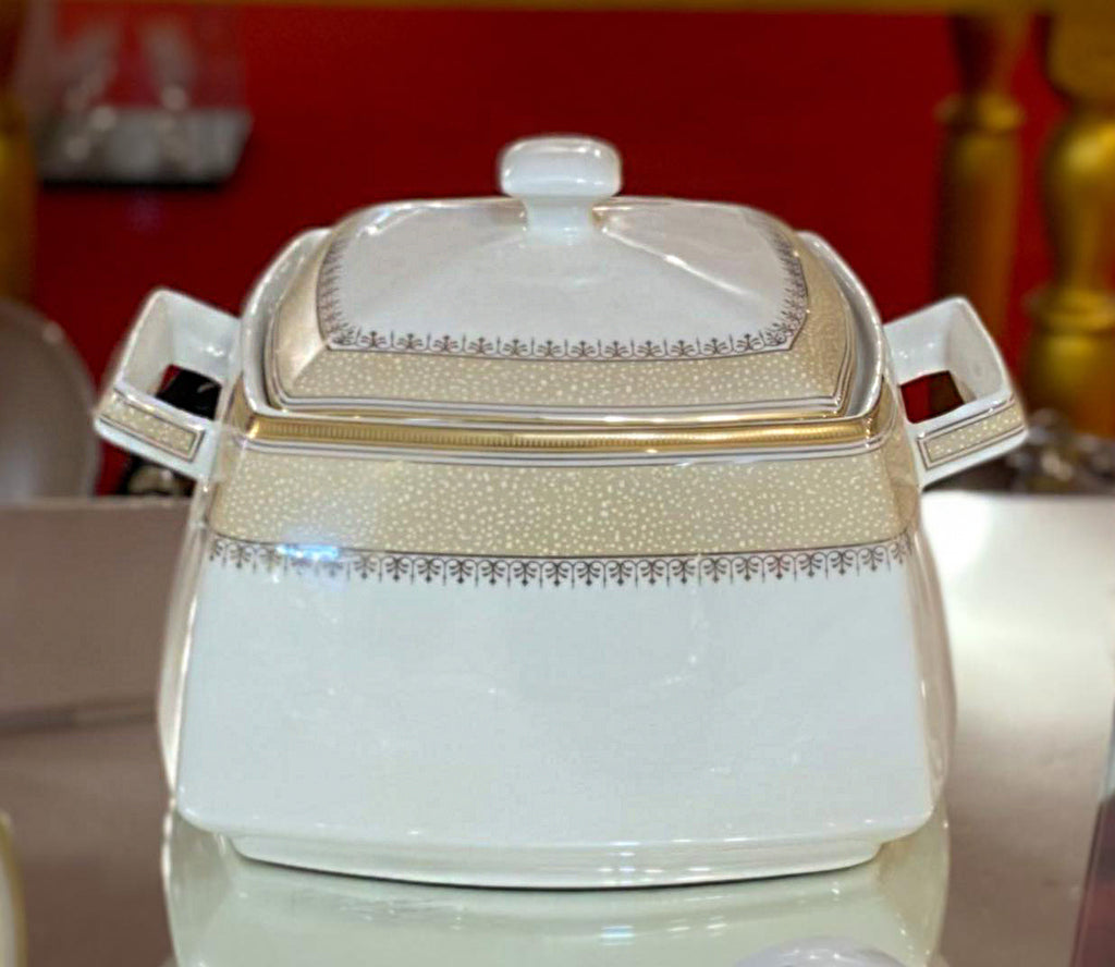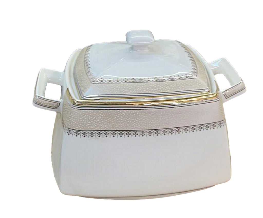 Supiera din portelan de inalta calitate, cu o capacitate de 3L. Cu un design interesant, modern, aceasta pastreaza totdata eleganta portelanului alb. Incapatoare si cu un capac practic, aceasta se poate curata cu usurinta in masina de spalat vase, si poate fi introdusa in cuptorul cu microunde.